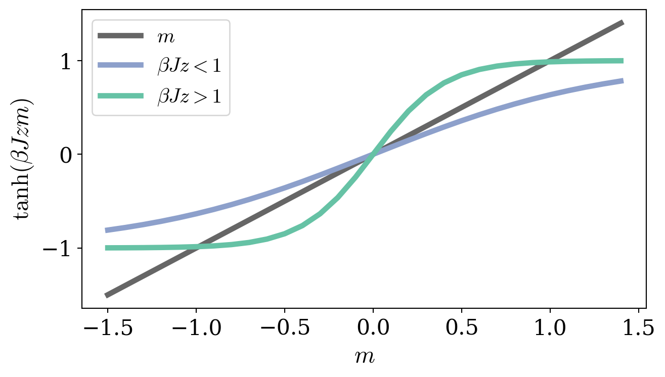 When the slope of the \(\tanh\) function at the origin is less than \(1\) there is only the trivial solution at \(m=0\). When the slope is greater than \(1\), there exist solutions at non-zero \(m\), so we expect a phase transition at \(\beta_c = (2JD)^{-1}\) where all of the spins collectively magnetize in the same direction and the system orders. Whether the system chooses the positive or negative solution for \(m\) is the subject of the fascinating topic of spontaneous symmetry breaking (Goldenfeld 2018).