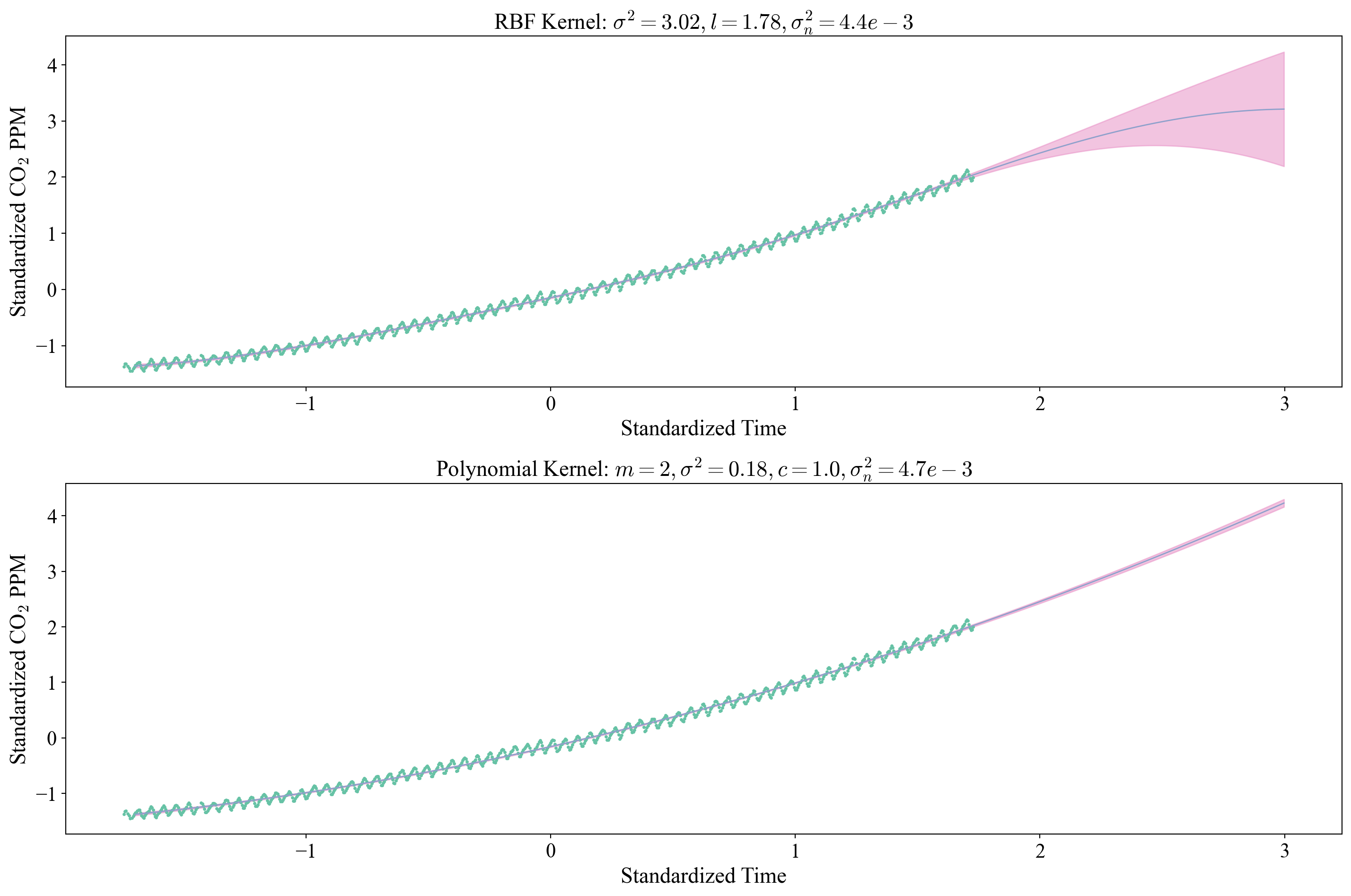 Let’s start by trying this with the RBF kernel. Looking at the results below we see that the hyperparameter optimization produced the same desirable behavior we saw before in our mileage dataset. The kernel variance \(\sim 3\) matches the overall spread of the data from the upward trend. \(l\sim1.8\) is much larger than the seasonal variation period, and has the effect of smoothing out the curve and generalizing well. The robustness of this model is also supported by the low observational noise \(\sigma_n\) and tight uncertainty bands for the fit near the training data. Unfortunately, once we move away from the train data on scales \(> l\) we see the posterior mean starts to revert to the mean, something that we have come to expect from the structure of the RBF. If we care about this trend persisting will the polynomial capture this better? Fitting this model does indeed look like it generalizes much better. The uncertainty also remains extremely low when we generalize beyond the training dataset. But we shouldn’t be so hasty as to say that the polynomial kernel is “better”. What if, perhaps, the world’s governments got their shit together and drastically limited carbon emissions? Modeling can’t account for things like this, so often the best we can do is be honest about our uncertainty when we try to generalize far away from what we’ve learned. In that sense the RBF model is perhaps better: it’s at least more honest about the fact that once we are far away from the data we shouldn’t trust our predictions anymore, and it even learns through \(l\) what constitutes “far away”.