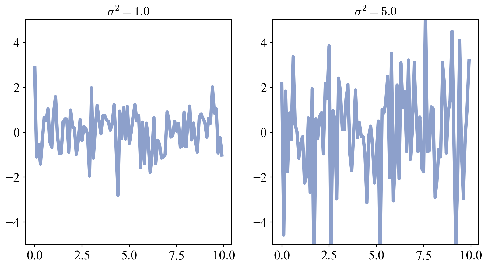 \end{equation}\] This is sometimes also referred to as the “RBF”, “Squared Exponential” or, “Gaussian” kernel. This kernel has the ability to sample from the entire infinite dimensional function space, and thus is a very powerful workhorse in the GP literature. Notice how the correlation drops with distance between input points. This has a “smoothing effect” in which nearby points are more correlated with each other. The hyper-parameters \(\sigma\) and \(l\) control the scale of fluctuations about the mean, and the lengthscale over which you expect your samples to sustain correlations, and hence remain “smooth” over (I know I made a big deal earlier about GPs being non-parametric, but these are “hyper”-parameters which serve a very different role and we will say more about later). You can see this behavior in the plots below, where we show samples from GPs with an RBF kernels with different scales and variances.