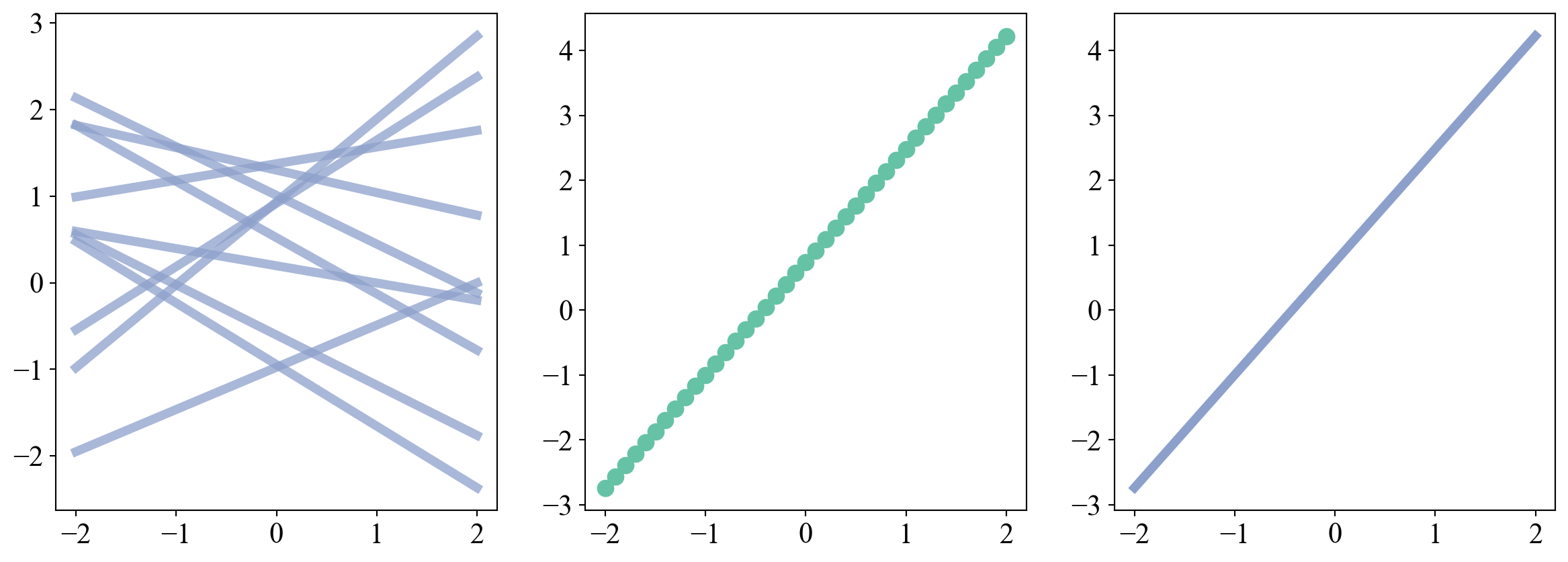 # Randomly sample parameters of linear function from priors def gen_random_lin_fn(): a, b = np.random.normal(size=2)returnlambda x: a*x + bxs = torch.arange(-2,2.1,0.1)# Plottingfig, ax = plt.subplots(1, 3, figsize=(15,5))for i inrange(10): f = gen_random_lin_fn() ax[0].plot(xs, f(xs), lw=5, alpha=0.75, c='#8da0cb')fn = gen_random_lin_fn()ax[2].plot(xs, fn(xs), c='#8da0cb', lw=5)ax[1].scatter(xs, fn(xs), c='#66c2a5', s=75)