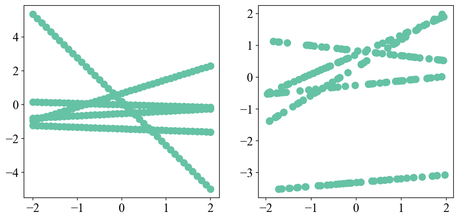 # Initialize GP with linear kernellin_GP = GP.GaussianProcess( kernel=GP.PolynomialKernel( m=1, log_c = torch.tensor(0.0), log_variance= torch.tensor(0.0) ), log_noise = torch.tensor(0.0))# Plottingfig, ax = plt.subplots(1, 2, figsize=(10,4.5))for i inrange(5): samp = lin_GP.sample(xs) ax[0].scatter(xs, samp, c='#66c2a5', s=75)for i inrange(5): xrand = torch.tensor(np.random.uniform(-2,2,size=len(xs))) samp = lin_GP.sample(xrand) ax[1].scatter(xrand, samp, c='#66c2a5', s=75)