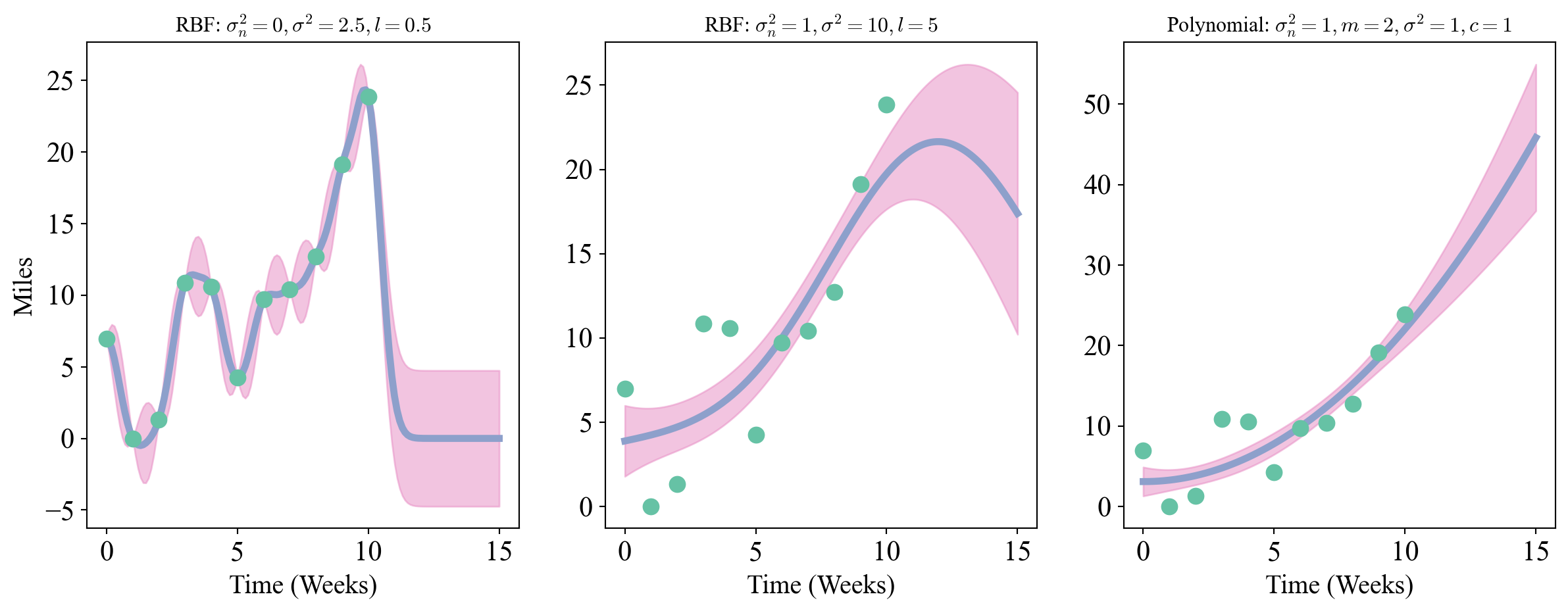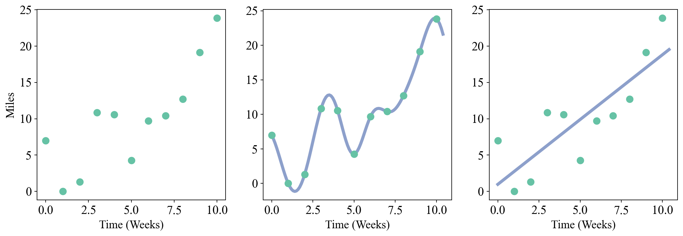 Figure 1: Left: How many miles I ran per week over the last few months. Middle: One possible regressing function that perfectly interpolates the data. Right: Another possible function which doesn’t interpolate by allowing for noise.