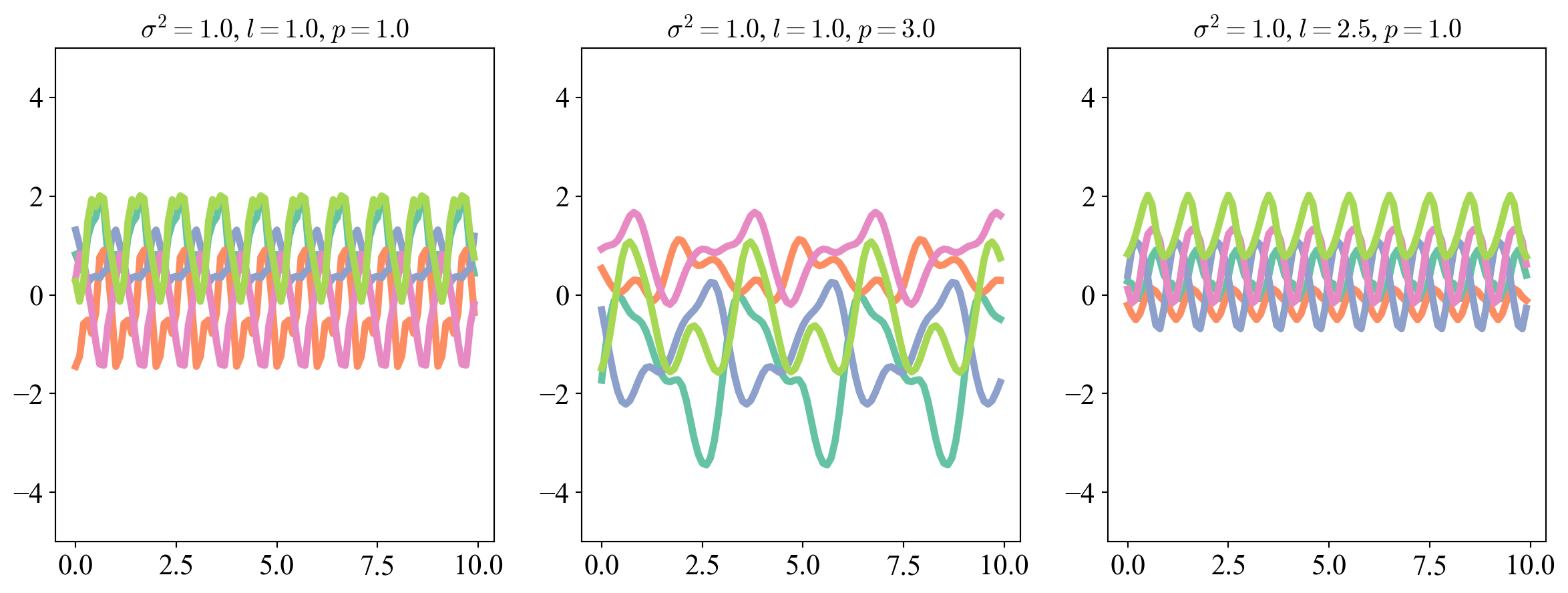 Figure 6: Samples from the periodic kernel under different hyperparameter settings.