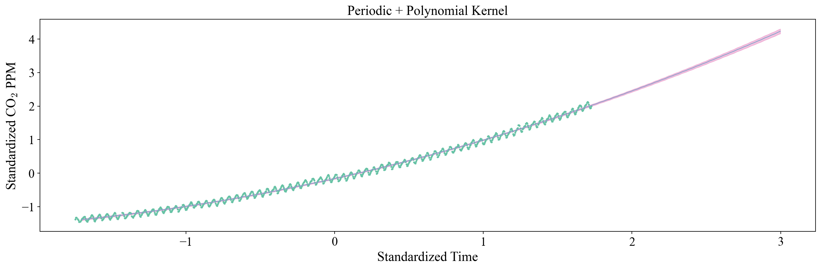 Figure 11: GP regression with the periodic + polynomial kernel fails to reproduce oscillatory behavior.