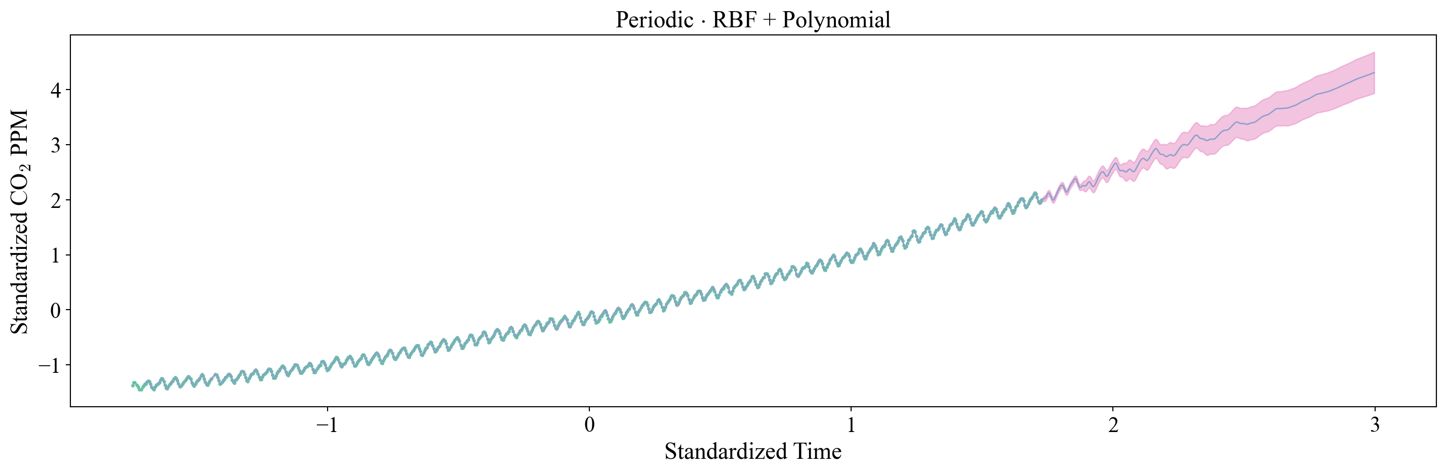 Can we go further, and try to model the oscillatory behavior? This seems like a perfect use case for our periodic kernel. Lets try a polynomial + periodic kernel, so we can capture the trend + oscillations on top of it.